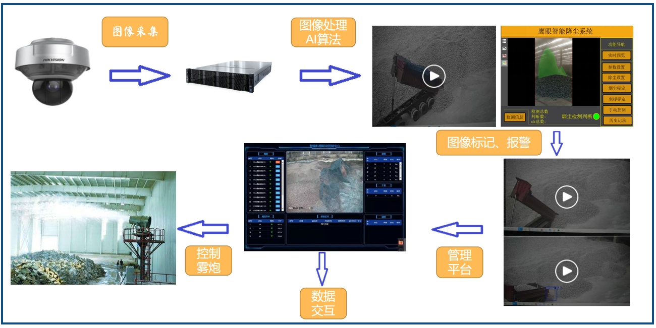 智易時代的鷹眼霧炮聯動系統是一種針對企業粉塵污染問題的解決方案。該系統通過智能控制霧炮系統,自動啟動并跟蹤作業車輛及粉塵煙羽進行噴霧降塵。它能夠識別粉塵污染區域并加以抑制,實現24小時、自動跟蹤、對起塵區域可視化污染物進行自動識別,減少粉塵污染的同時,有效的降低了治理成本。